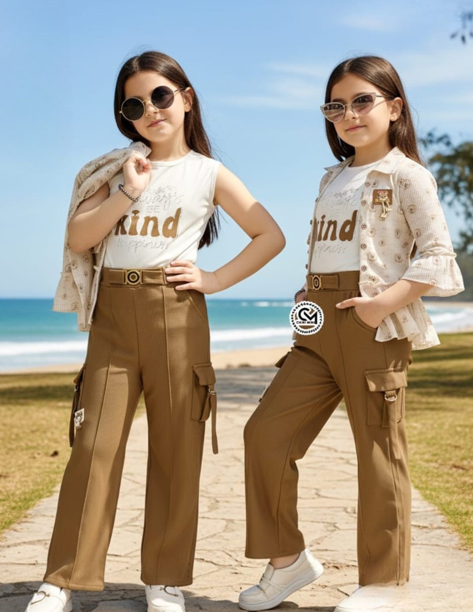 Design: “Be Kind” printed top with lightweight shrug and tan-brown cargo pants