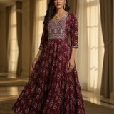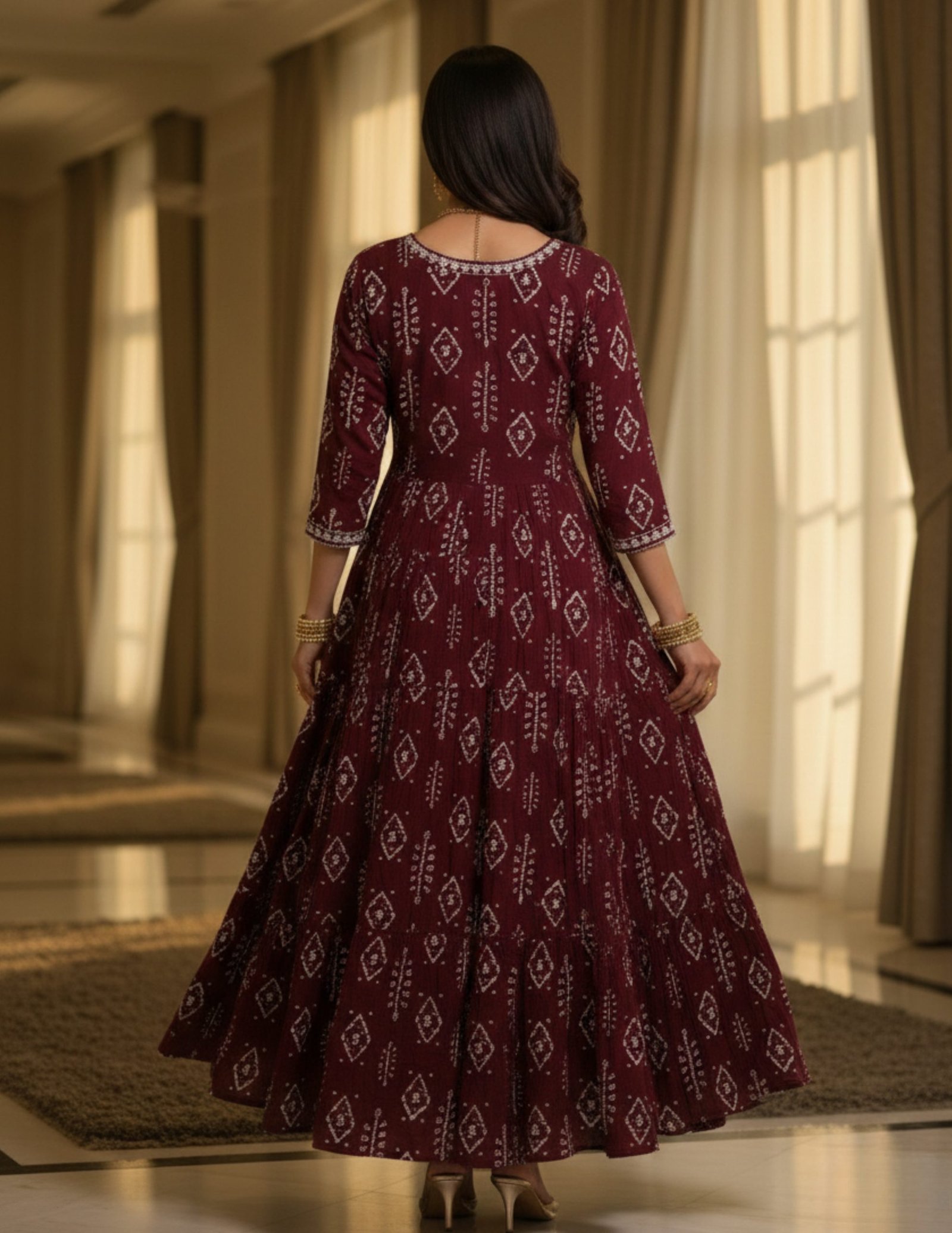 Design: Beautiful flared Anarkali kurti with all-over print and detailed white embroidery on yoke and 3/4 sleeves