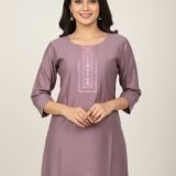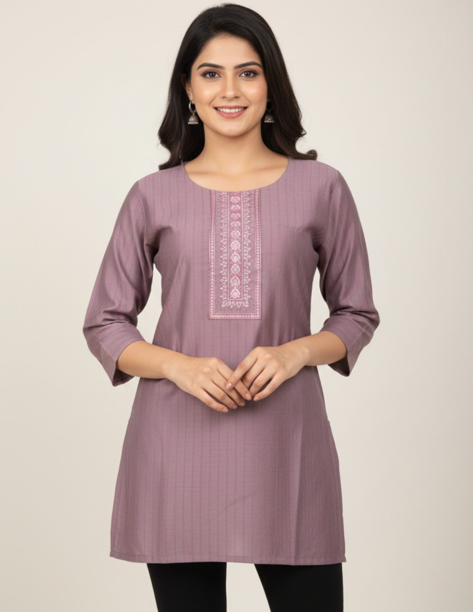 Design: Straight-fit short kurti with white embroidery on yoke and 3/4 sleeves